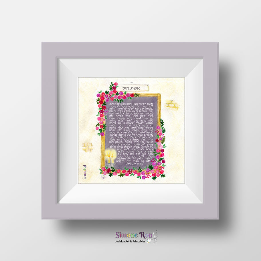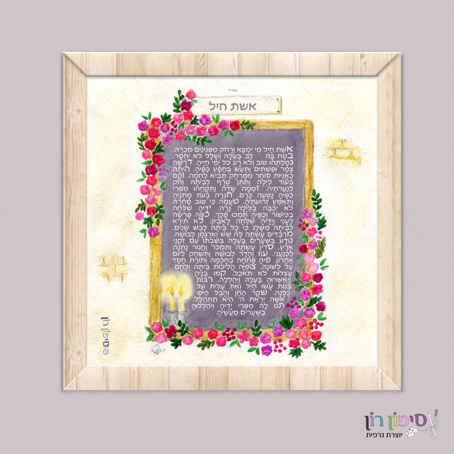 "אשת חיל"- מילותיו הקדושות של המלך שלמה (משלי ל"א) עם איור מקורי עדין וקסום. מסורת יהודית עתיקה היא שבליל שבת לפני הקידוש, בעלים שרים זאת לכבוד נשותיהם בהוקרה ואהבה.